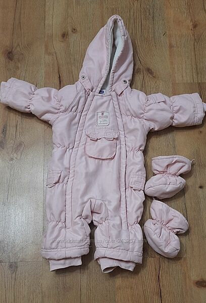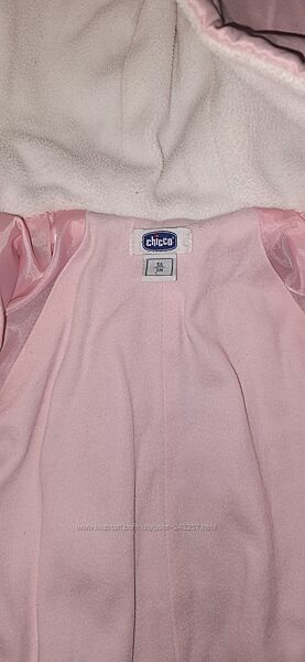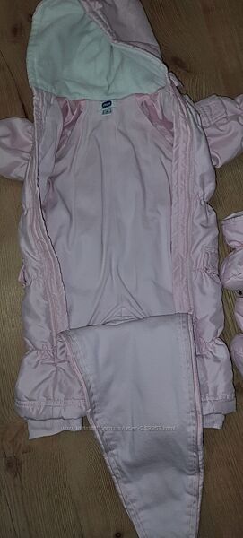 Комбінезон чіко, стан ідеальний, після однієї дитини, придбаний в Греції.Утеплення- синтепон, підкладка - котон. Колір дуже ніжний рожевий, приємний для ока. Тканина не блистить.За гарної погоди спробую зробити додаткові фото.