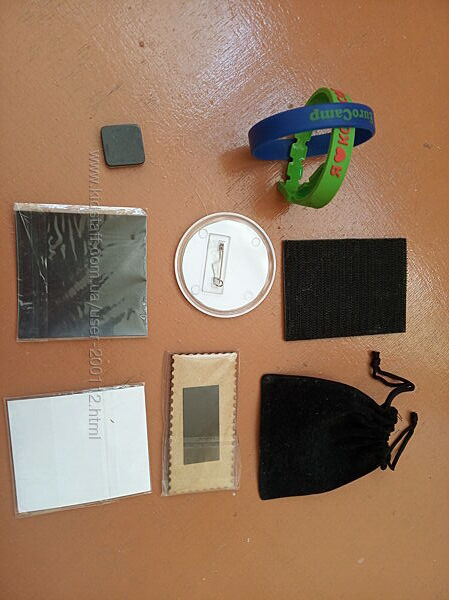 Значок, шеврони, магніти на холодильник і браслети з українською символікою.1) Браслет резиновий синій. Стан абсолютно нового. З однієї сторони напис Euro Camp, з іншої kngu. org. Окружність 21 см, дуже добре тягнеться.