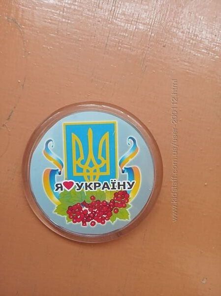 4) Значок я люблю Україну. Стан нового. Без упаковки. Діаметр 6 см. Спереду прозора пласмаса. Ззаду шпилька, щоб пришпилювати, наприклад, до одягу.