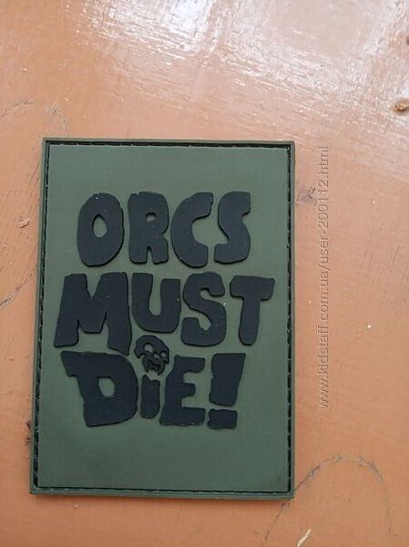 3) Шеврон з написом Orcs must die! Стан майже новий ( якщо сильно придивлятися, то може й можна придертися, але то треба бути дуже прискіпливим ), без упаковки. Лицьова сторона резинова, задня сторона липучка з такими маленькими крючечками на кінцях. Розмір 8.5 см на 6 см. Фон військово-оливковий, напис чорний.