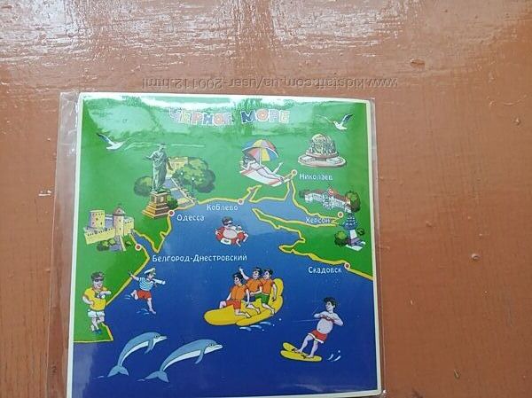 5) Значок на холодильник з написом Черное море. Стан абсолютно новий - в прозорій упаковці, яка ніколи не відкривалась. Розмір 7 на 7 см. Не папір, а ніби як міцний картон, але не згинається. На зображенні також позначено населені пункти Белгород-Днестровский, Одесса, Коблево, Николаев, Херсон, Скадовск. З зворотньої сторони по всій площі магніт, щоб прикріпити до металевої поверхні.