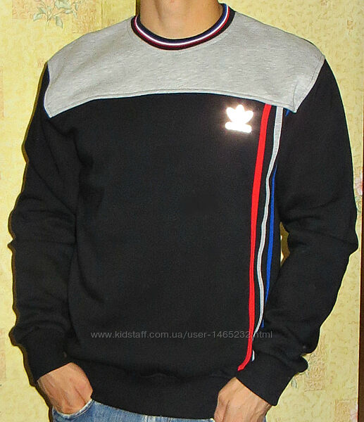 Трикотажный свитшот, внутри на флисе. Эмблема - светоотражающая накатка. Цветные полоски нашиты из ткани.