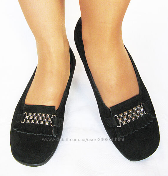Материал верха - натуральная замшевая кожа насыщенного черного цвета, очень мягкая и эластичная, язычок декорирован металлической фурнитурой