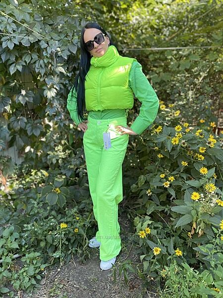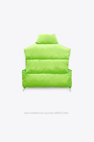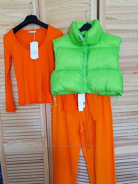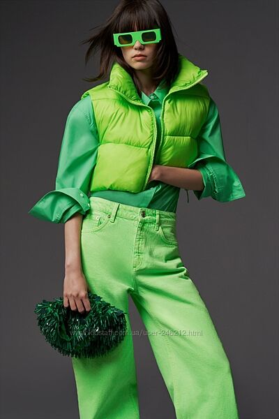 Стеганная жилетка пуффер Zara .Весь яркий лук с первого фото есть , и рубашка и лаймовые джинсы.
