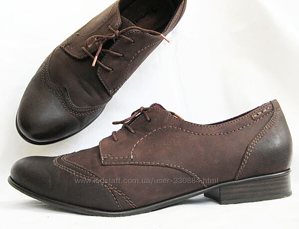 294. Удобные осенние туфли, полуботинки, дерби известного немецкого бренда "Tamaris" в очень хорошем состоянии без недостатков, просто несколько раз надеты, подошва без износа, чистые и аккуратные, без посторонних запахов.Модель - дерби (открытая шнуровка): берцы нашиты поверх союзки. Проще говоря, боковые стороны таких туфель пришиты поверх передней части, поэтому когда шнурки развязаны, боковины свободно расходятся (их можно отогнуть практически на 180 градусов).