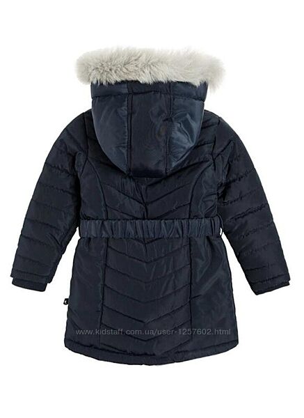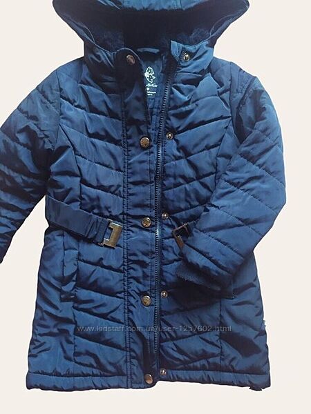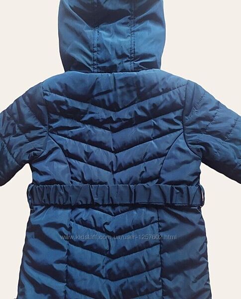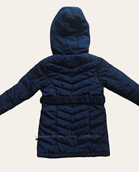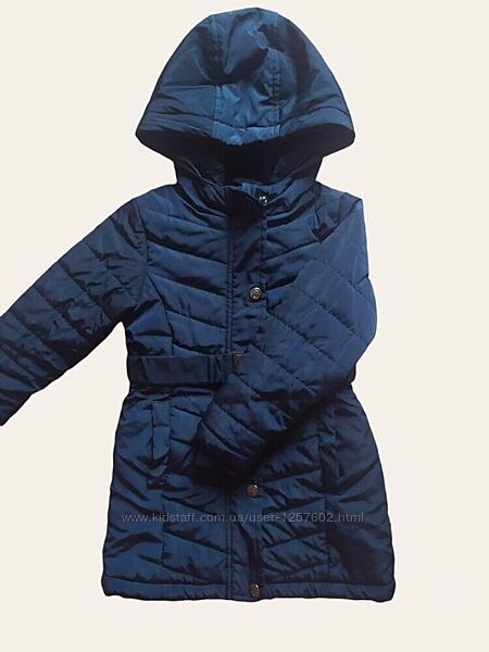 Теплая удлиненная демисезонная куртка с поясом и вшитым капюшоном с мехом на худенькую девочку.Рукава с манжетами, по бокам функциональные карманы.