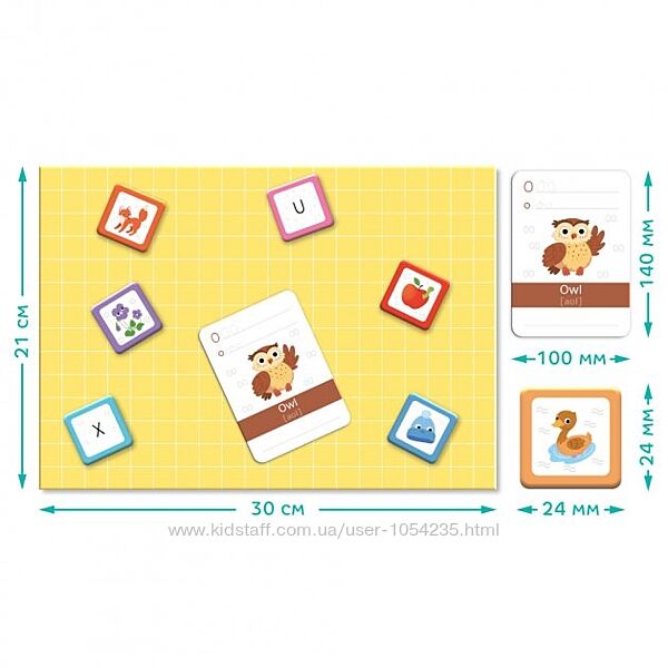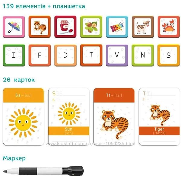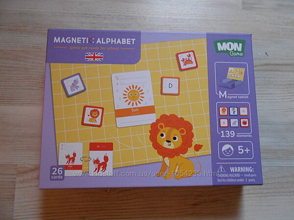 2. Настольная игра Dodo Magnetic alphabet поможет ребенку интересно и познавательно провести время. На каждой карточке одна буква,слово, которое начинается с этой буквы - место для обучения письму. Это двойная польза - ребенок учит и буквы алфавита, и слова. Можно играть только с карточками,добавлять поиск соотношений,изучать цвета.Комплектация: 1 магнитная доска, 139 магнитных элементов, 26 карточек, сухостираемый маркер. Размер магнитной доски 21х30 см., размер магнитов 2,4х2,4 см., размер карточек 14х10 см. Развивает: изучение букв, развитие мелкой моторики, развитие памяти, внимания, воображения. Возрастная категория 5+.Цена: 300 грн.