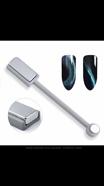 Магнит двусторонний для гель-лака кошачий глаз. ⠀ Изделие, способное работать с декоративными покрытиями, содержащими металлизированные частички. Представляет собой основу с держателем и вставленный в нее прямоугольный магнит-брусок с одной стороны и круглый - с другой. При взаимодействии с гелевыми лаками магнит подтягивает микрочастички металла, образуя красивый четкий и тонкий блик (прямой или круглый, в зависимости от стороны магнита). Пользоваться магнитом очень просто: выполните декоративный маникюр, нанеся слой гель-лака с эффектом «кошачий глаз», разместите над окрашенным ноготком магнит (близко, но так, чтобы не повредить покрытие), подержите пару секунд, затем полимеризуйте. Нейл-дизайн с ярким и четким бликом придаст ногтям особую прелесть и оригинальность. ⠀ Размеры ( /-): длина общая 9,7 см, длина прямоугольного магнита 2,5 см, ширина прямоугольного магнита 1 см, диаметр круглого магнита 0,7 см. ⠀