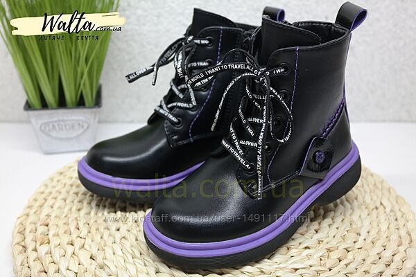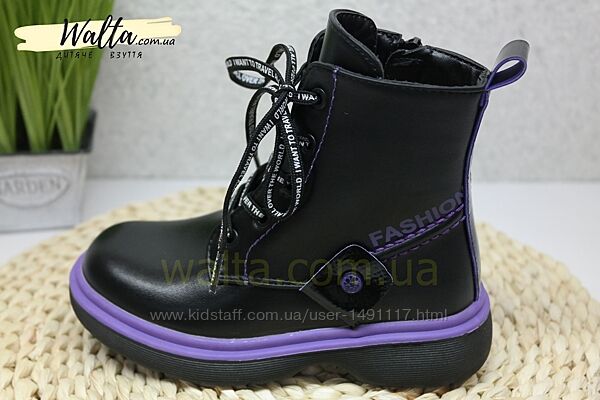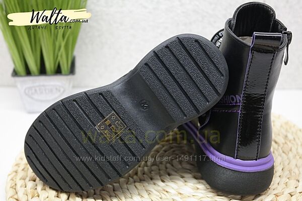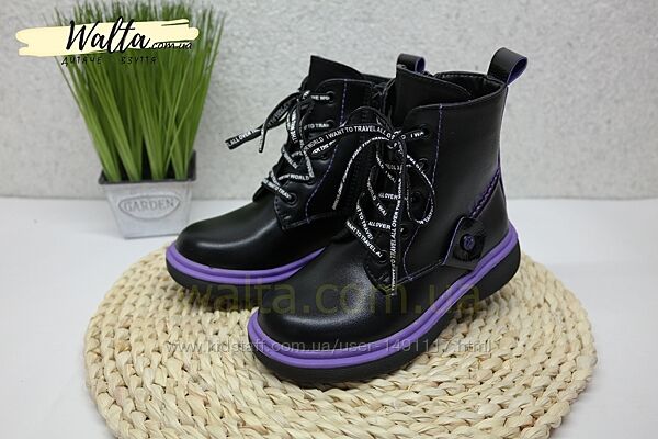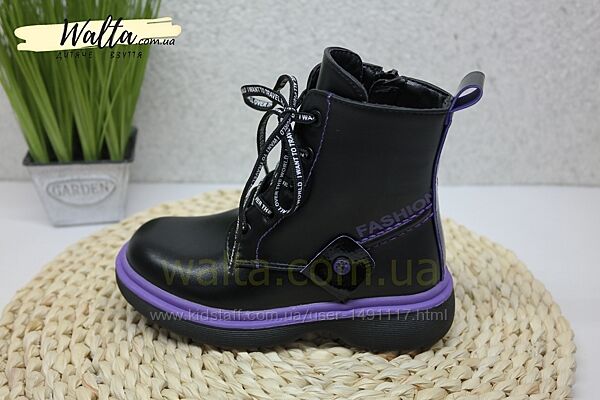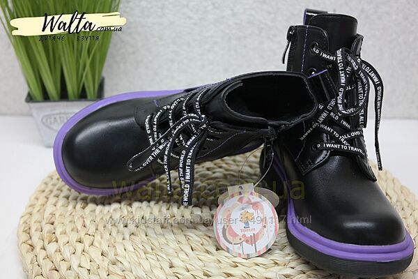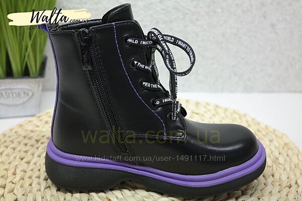 Фірма Том.м. Стильні демісезонні черевики для дівчинки чорні з фіолетовою підошвою. Легенькі. В середині плюш мякий (утеплення). Устілка на плюші. На замочці збоку.
