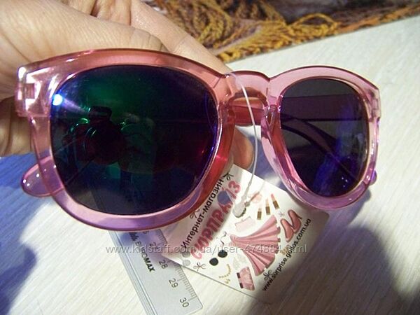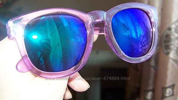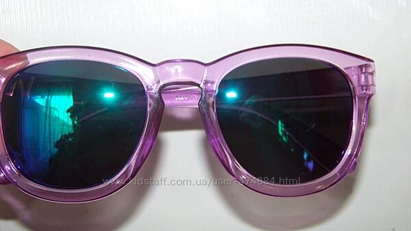 Очки в округлой пластиковой полупрозрачной оправе сиренево-розового цвета, с зеркальными линзами из поликарбоната, серебристой буквой W на дужках, UV400 или 100% защита от солнца, размер линзы 4.4 на 5 см, высота очков 5.4 см, ширина оправы 14.3 см, длина дужки 14 см. Линза сине-фиолетовая зеркальная.Распродажа остатков магазина! Цена на бирке 166 грн!