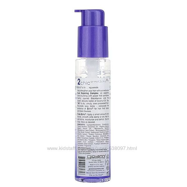 Наш эксклюзивный двойной восстанавливающий комплекс укрепляет ваши волосы. Он содержит наполненную энергией смесь незаменимых компонентов с антиоксидантными свойствами, включая свежую спелую ежевику и сладкий нежный нектар кокосового масла. Скажите «НЕТ» сухим, непослушным, безжизненным волосам. Подарите себе сексуальный образ — откройте для себя 2chic® для безупречного внешнего вида и здоровья волос.