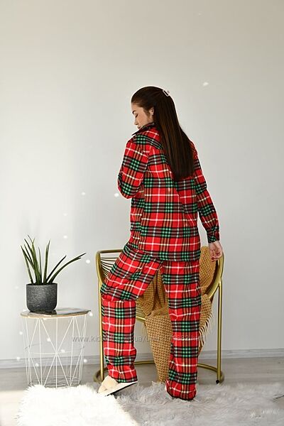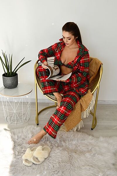 Піжамний костюм у клітинку з якісної тканини, байкаКомплект: зручна сорочка з гудзиками з коміром, бра без чашок на застібці, бретелі регулюються, вільні штани з кишенями на гумці.