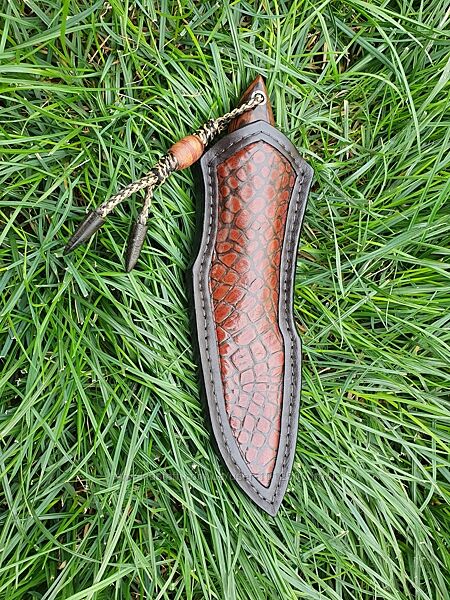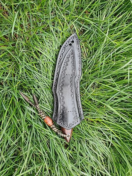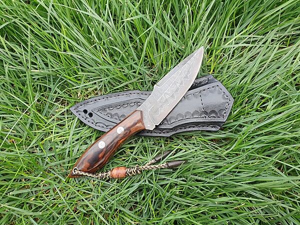 На рукояти Железное Аризонское дерево "Ironwood", плотность 1250 кг/м3, пины та фальш-темляк, ножны (ручной работы) - натуральная кожа.