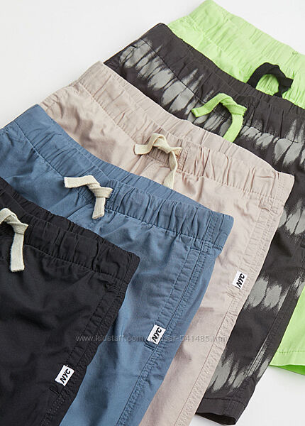 Шорти з комплекту 5 пар із тонкої бавовняної тканини, довжиною до колін. Попереду бічні кишені та застібка – обманка, усередині пояса широка гумка та шнурок, що діє. Продаються поштучно, бірка на одних. Із нової колекції дитячого одягу провідного європейського бренду H&M.Розмір у наявності: 10-12 років, зріст 146-152 см,