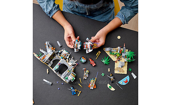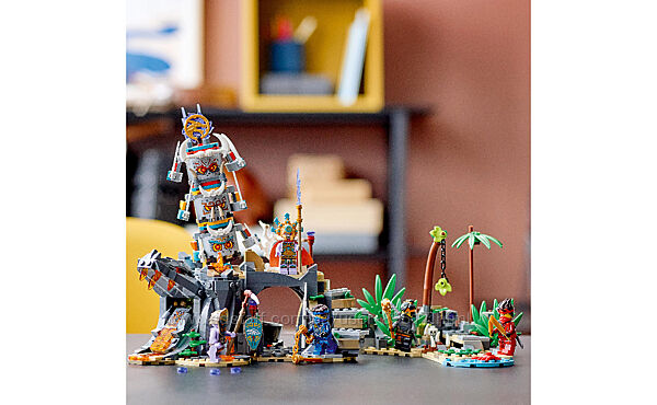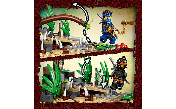 LEGO Ninjago Село Охоронців 71747Вирушайте в рятувальну місію та визволіть ніндзя з полону в Селині Охоронців! Допоможіть Коулу, Джею і Кай битися зі страхітливим вождем Мамматусом і Хранителем гуркоту в їхньому небезпечному укритті в джунглях. Але бережіться пасток і захованих шутерів, що стріляють вогнем та отрутою. І, звісно, не розбудіть кам´яних монстрів! Звільніть ніндзя з полону та заволодійте амулетом бурі.