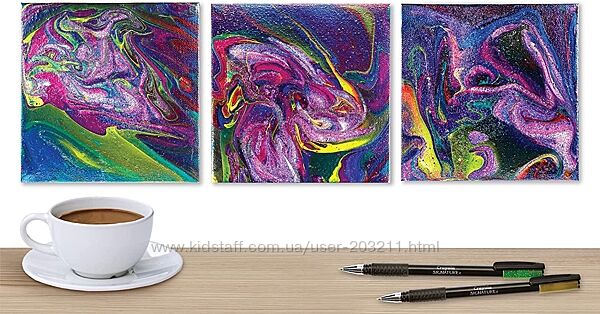 В наборі: 3 міні-основи (12.7 см * 12.7 см), 6 акрилових фарб, 10 чашок для змішування, 1 фарба з блискітками, 7 паличок для перемішування, 1 пара рукавичок і 1 посібник.