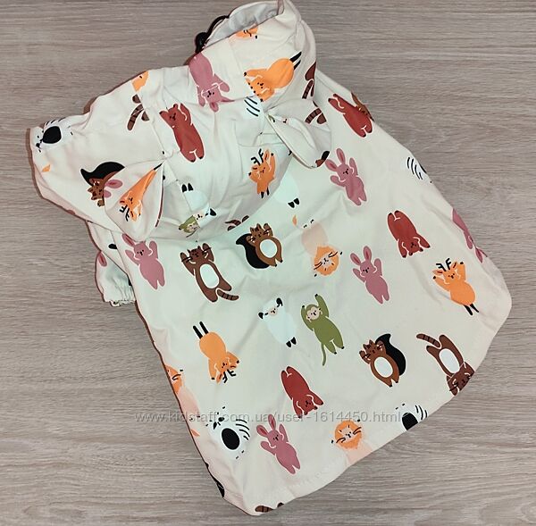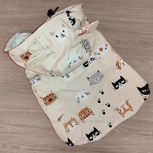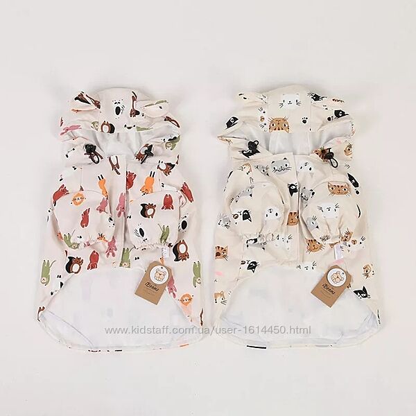 Нереально классный водонепроницаемый дождевик для булочек! Снаружи водоотталкивающая плотная микрофибра, внутри водонепроницаемая подкладка. Застегивается на груди на липучку. На спинке есть отверстие для поводка. Удобно фиксируется резинками на задних лапках. Объемный капюшон регулируется резинкой на стяжках, декорирован ушками. Очень круто смотрится и надёжно защищает от дождя! Идеально подойдет для французского бульдога и мопса. Нежно- бежевый цвет с элегантными котиками или разноцветными зверюшками.