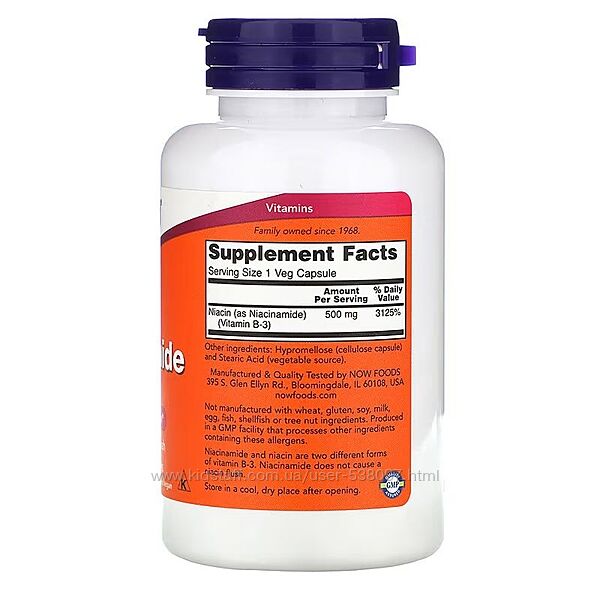NOW Foods никотинамид. 500 мг, 100 вегетарианских капсул.