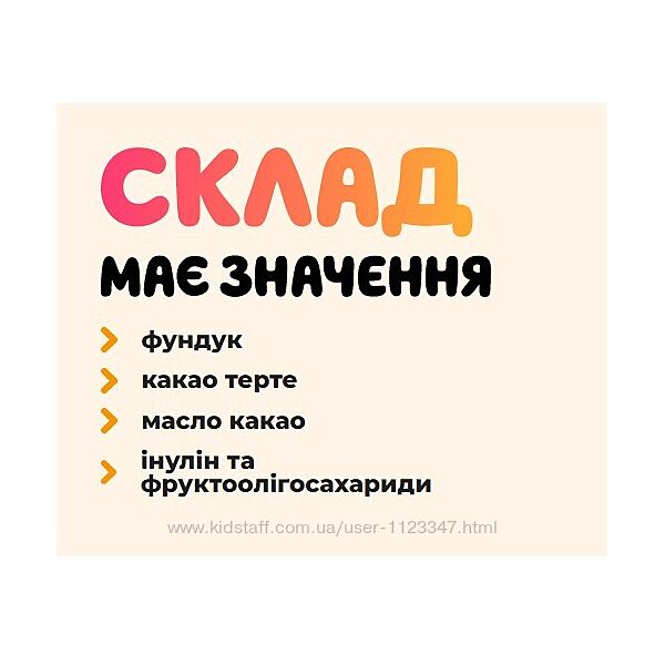 Не містить: ароматизаторів, барвників, консервантів трансжирів, пальмової олії соєвого лецитину лактози та сухого молока арахісу та його слідів цукру.