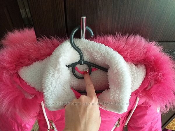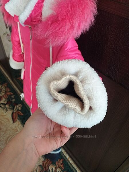 всередині, ще є трикотажний манжет. На талії (в середині) та внизу передбачена стяжка/куліска для регулювання об´єму. Каптур на блискавці (відстібається), є зав´язки. Хутро пухнасте, від каптура відстібається (на блискавці). Заміри курточки: Довжина від плеча до низу -43 см; Ширина у плечах -29 см.; Довжина плеча-8см.; Довжина рукава - 43 см. (повна, можна вкоротити підвернувши манжет на