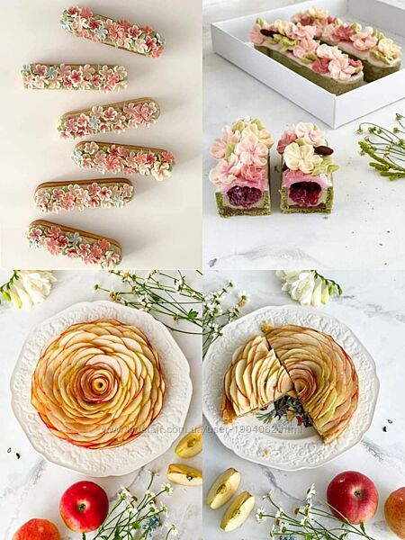 – Сабле с чаем матча. Вишневый хрустящий слой. Крем с чаем матча. Вишневое компоте. Кремовые цветы