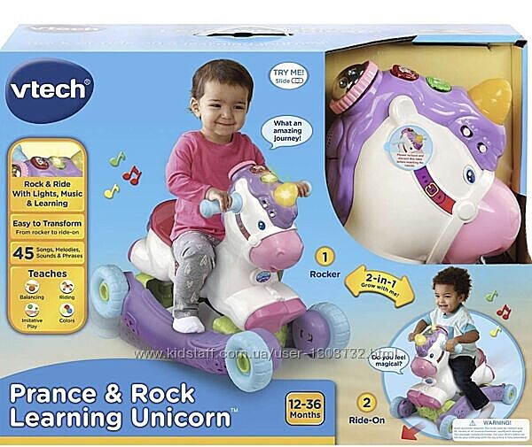 Єдиноріг «рости разом зі мною» VTechПеретворюються з гойдалки в каталку за секунди. Коли малюки гойдаються і катаються, вбудовані датчики руху реагують грайливою музикою і чарівними звуками, стимулюючи розвиток і уяви.