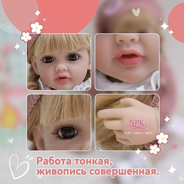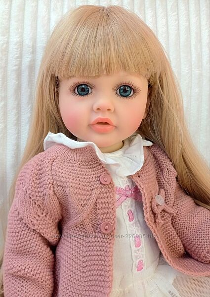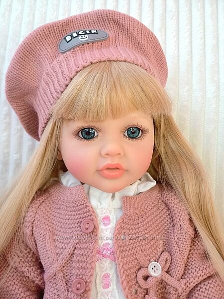 Лялька розфарбована вручну акриловими фарбами.Тіло з мёякого выныл-силыкону, що робить ляльку приємною на дотик.Руки, ноги та голова рухливі, лялька може сидіти та лежати.Очі виготовлені из акрила (не заплющуються). На повіках пухнасті вії.Довгі пишне волосся ідентичне натуральному, можна розчісувати.Лялечка одягнена в бодік-сукню, кофтинку, берет, шкарпетки та черевички.