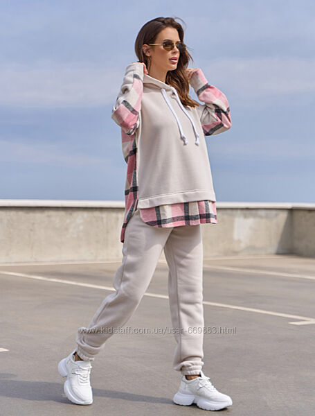 Теплий спортивний костюм з трикотажу на флисі з картатою байковою вставкою. Толстовка вілного подовженооо крою з капюшоном, довгими рукавами та боковими розрізами. Брюки на ґумці в поясі, з кишенями та еластичними манжетами.Розмірний ряд: S, M, L, XL