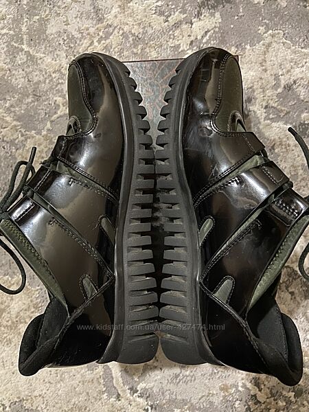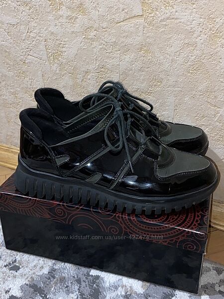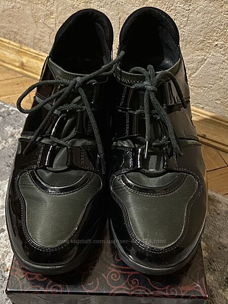Кросовки черевички лакові чорні зі вставками прорезиненої тканини темно-зеленого кольору. Дуже зручні в носці і гарно виглядають.Вказано р.39, але підійдуть і на 38- по стельці 25см. Єдиний нюанс- з тильної сторони міні- потертості в районі кісточки, в носці непомітні.