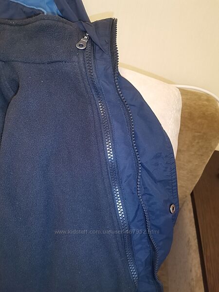 Куртка 3 в 1: флисовая кофта на змейке, ветровка, утепленная куртка. Застёжка змейкс+ планка на кнопках, ширина рукавов регулируются липучкой, капюшон с утяжками, отстегивается. Флисовая кофта на змейке с карманами. Пристегивается вк ветровка с помощью змейки. Все змейки рабочие. Из нюансов: воротник на флисовой кофте немного разошёлся шов, на ветровке на спинке есть небольшая потёртость. Фото пришлю.