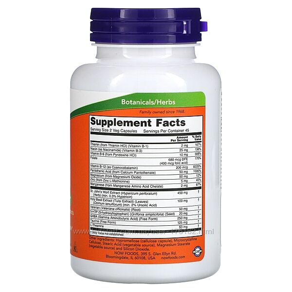 Розмір порції: 2 капсули Порцій в упаковці: 45 В складі: Тіамін (вітамін B1) - 2 мг Ніацин (вітамін B3) - 25 мг Вітамін В6 (у вигляді піридоксину гідрохлориду) - 10 мг Фолат (400 мкг фолієвої кислоти) Вітамін B12 (у вигляді ціанокобаламіну) - 200 мкг Пантотенова кислота - 50 мг Магній - 50 мг Цинк - 5 мг Марганець - 2 мг Екстракт трави звіробою - 450 мг Екстракт листя базиліку священного - 100 мг Корінь валеріани (Valeriana officinalis) (концентрат 4:1) - 50 мг 5-HTP (5-гідрокситриптофан) з насіння гріфонії (Griffonia simplicifolia) - 20 мг GABA (гамма-аміномасляна кислота) у вільній формі - 250 мг Таурин (у вільній формі) - 125 мг L-теанін - 50 мг