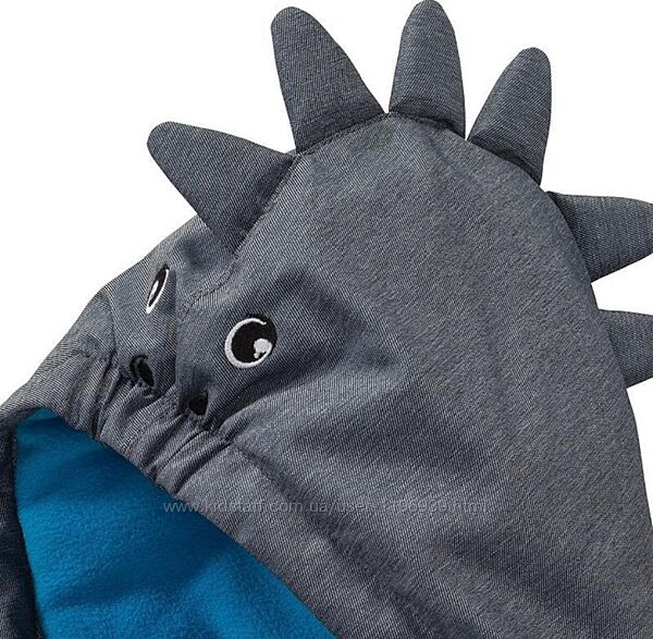 - Капюшон 3D, несъемный, с вышивкой мордочки динозавра и шипами.