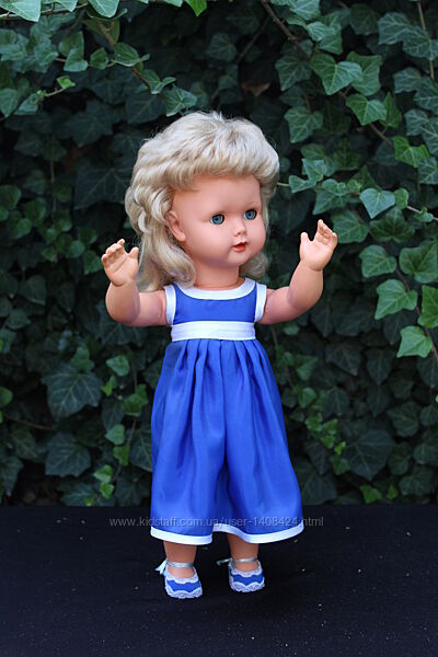 Чудесная игровая кукла 45 см.Голова виниловая, все остальное пластик. Кукла в стиле 50гг. Волосы очень хорошего качества, прошиты по всей голове, после мытья сами укладываются в прическу. Глаза голубые, работают синхронно. Красные губки, а во рту белые зубки. Пухленькая и красивая. Пищик не работает.Одежда для куклы пошита.