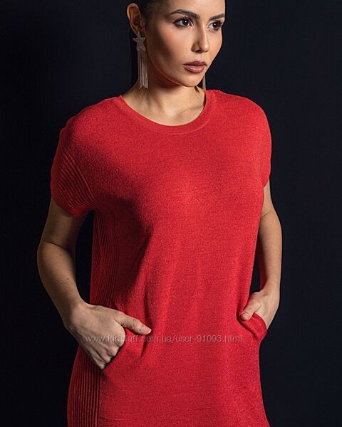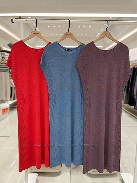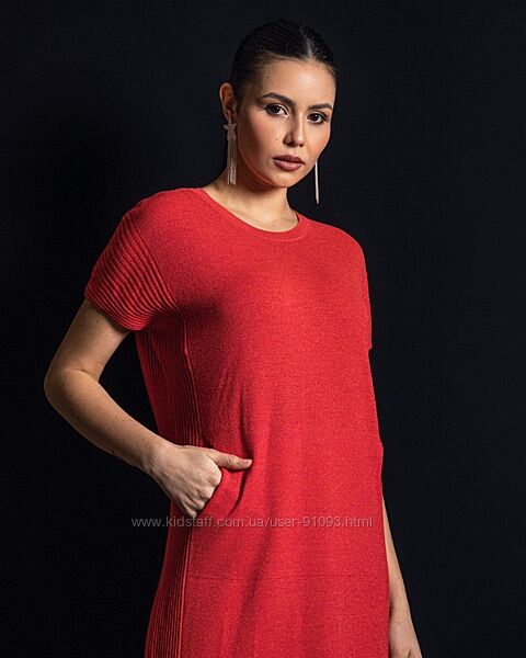 Трикотажное платье высокого качества с короткими рукавами с круглым вырезом.