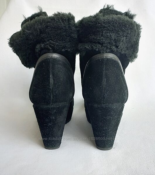 Пропоную зимові черевики від Guess. Матеріал верху - натуральна замша. Внутри штучне хутро. Вживані один раз, акуратно, стан відмінний, дефектів немає, дивиться фото.Розмір вказаний 38, довжина устілки всередині 24,5 см, танкетка 8 см, з них платформа 2 см.