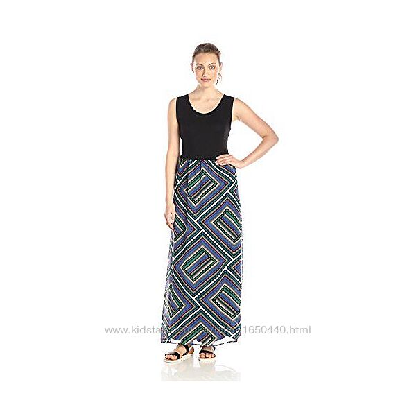 Восхитительное макси-платье с шифоновым низом Calvin Klein, размер L в пол. Макси-платье с круглым вырезом, однотонным трикотажным лифом и шиофновой юбкой с геометрическим принтом с нижней юбкой черного цветаЛиф: 95 % вискоза, 5 % спандекс; Юбка: 100% полиэстер