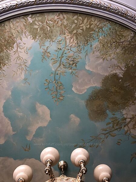 Ручная роспись потолка в стиле ампир - такой уникальный опыт получили художники студии «ОМИ». Реализация проекта по художественному оформлению интерьера в античном стиле была полностью доверена мастерам студии «ОМИ».По задумке авторов, именно роскошная роспись потолка в обрамлении позолоченной лепнины, должна стать выразительным акцентом пространства. Художники студии «ОМИ» изучили множество исторических образцов в разных направлениях, чтобы создать идеальный эскиз, который гармонично дополнит интерьер, но не будет перетягивать на себя внимание. Результат впечатлил не только заказчиков, но и опытных мастеров, ведь роспись получилась действительно аутентичной и ненавязчивой, и в тоже время придавала особый шарм интерьеру.