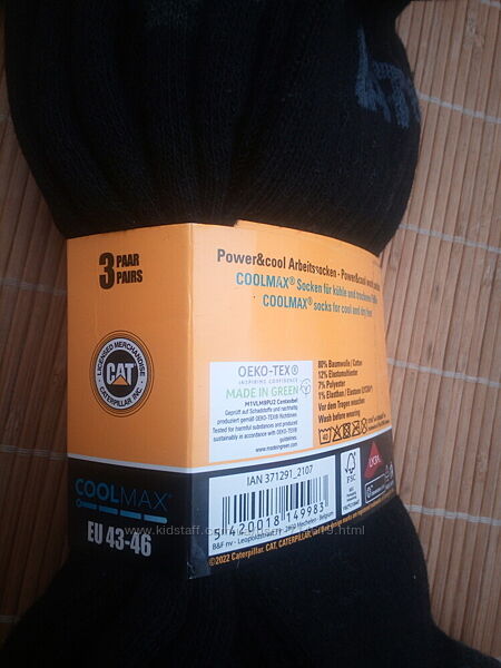 Caterpillar Power Cool Worksocks - якісні шкарпетки для роботи, спорту та туризму. Виготовлені з матеріалу Coolmax та лайкри, щоб зберегти ноги у прохолоді і сухості, зменшувати потовиділення та не здавлювати стопу і кісточку.. Подвійне посилення на носку і п´яті, сплетене з якісної чесаної бавовни, махрової бавовни та лайкровоговолокна для запобігання появи мозолів. Шкарпетка створена для того, щоб