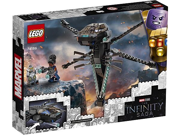 Конструктор LEGO Super Heroes 76186 Корабль Чёрной ПантерыОтправляйтесь на финальную битву на «драконе» Чёрной Пантеры. Перемещайте 4 подвижных крыла вперед, назад, вверх и вниз, чтобы выполнять рискованные маневры на максимальной скорости. Берегитесь бластера воина Читаури и откройте ответный огонь из шутеров. Поднимите фонарь кабины, чтобы выбрать пилота — Черную Пантеру или его сестру Шури, — и снова взлетайте в воздух на главном боевом самолете Ваканды.