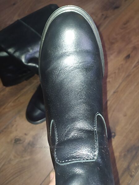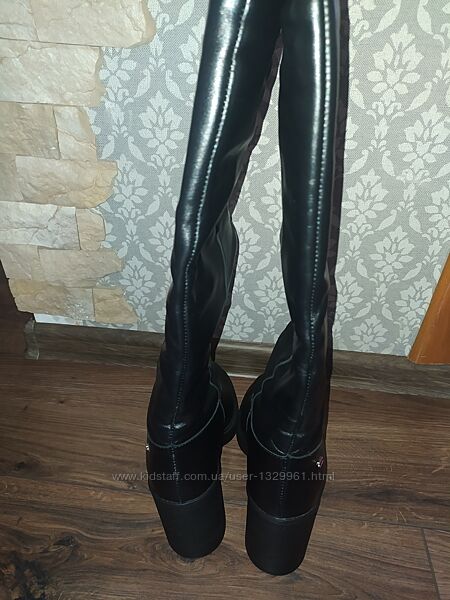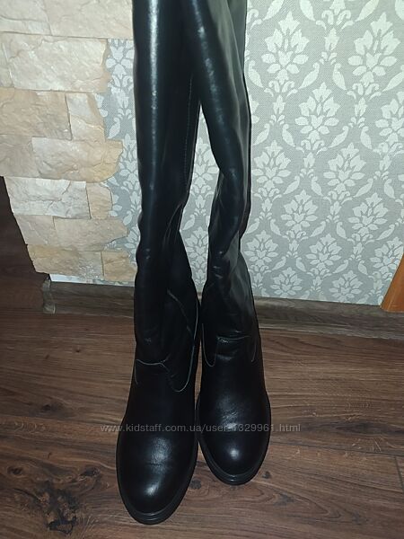 Чорні чоботи 39 розміру, натуральна шкіра, виробництво України. Взувала раз чи два, стан нових . Голенище утеплене байкою, знизу єврохутро. Каблук цільний, висота 10 см. Висота сапожок 41 см, обхват голенища приблизно 39 см. Моя стопа 24,7 см.Без повернення