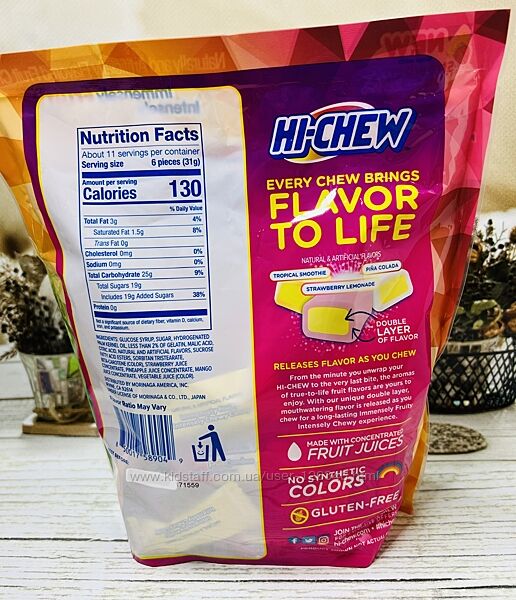 Жувальні цукерки Hi-Chew з фруктовими смаками відрізняються насиченими ароматами і мають приємну тягучу консистенцію. Вони не прилипають до зубів і поступово розчиняються, даруючи море задоволення і залишаючи дуже приємний післясмак. Десерт виготовлений з високоякісної сировини на основі натуральних соків, тому він не шкодить здоров´ю, а їх смак дуже природний.