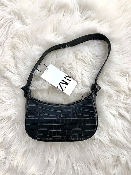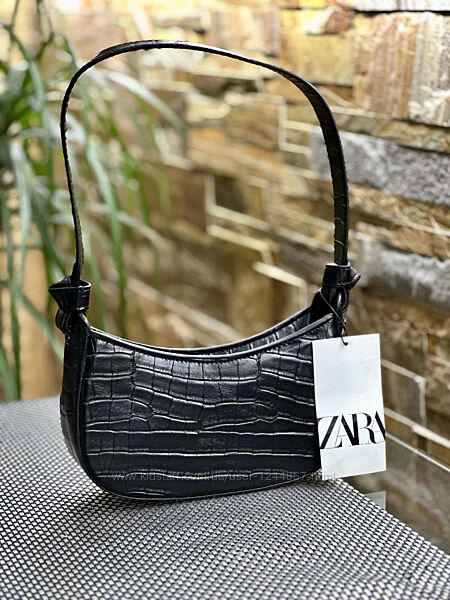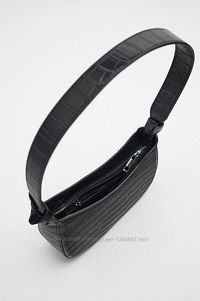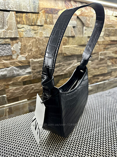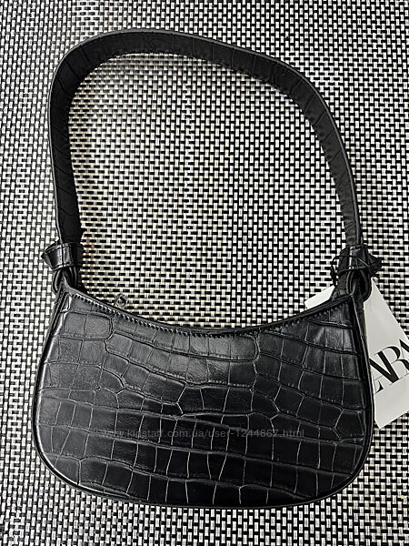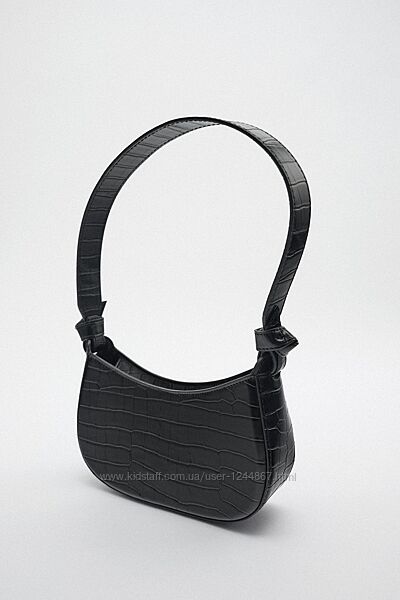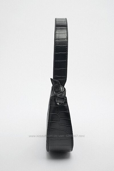 Сумка у формі півмісяця з тисненням.Має підкладку, внутрішню кишеню та ремінець на плече з бічними вузлами. Застібається на блискавку.