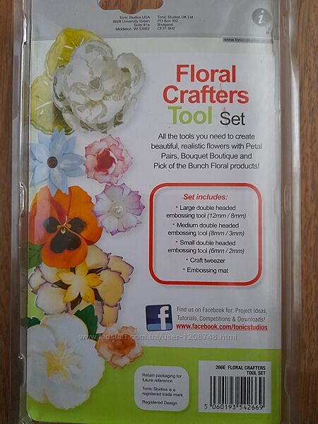 Набор инструментов для создания объемных цветов Tonic Studios - Floral Crafters Tool Set для скрапбукинга и рукоделия новый в упаковке.Набор инструментов для создания объемных цветов Tonic Studios - Floral Crafters Tool Set. Включает 3 инструмента с 2 наконечниками каждый, специальный пинцет и коврик. Круглые наконечники имеют диаметр: большой - 12mm и 8mm, средний - 8mm и 3mm, маленький - 6mm и 2mm. С помощью пинцета легко держать и крепить мелкие детали цветов. Инструменты оптимально с дыроколами McGill и цветочными дыроколами Tonic Studios, но могут также использоваться и с дыроколами других брендов и цветами, вырезанными вручную