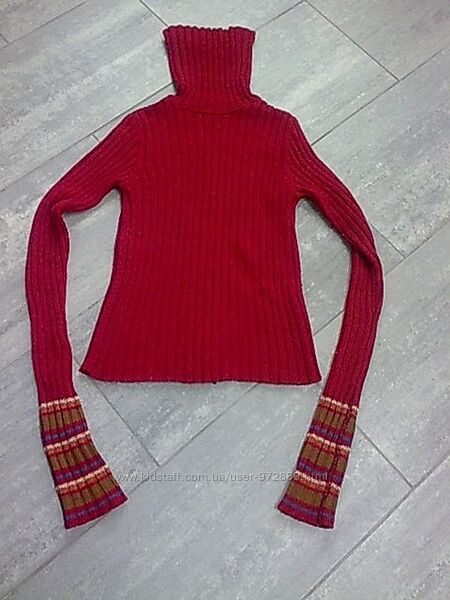 30 %шерсть, 70 %акрил. В носке оч.хорош-не скатывается, легко ухаживать. Очень плотненький и теплый. Модная вязка-резинка. Расцветка гладкая, только полосочки на рукавах. Интересные оч.длинные рукава.Можно подворачивать на любую высоту. Ношен с удовольствием,просто вытеснился новыми вещами. Состояние очень хорошее.. Длина по спинке 56 см,,между подмышками 41 см ,хорошо тянется.Какой-то всеразмерный. Состав:30 %шерсть,70 %акрил