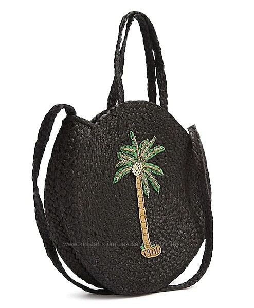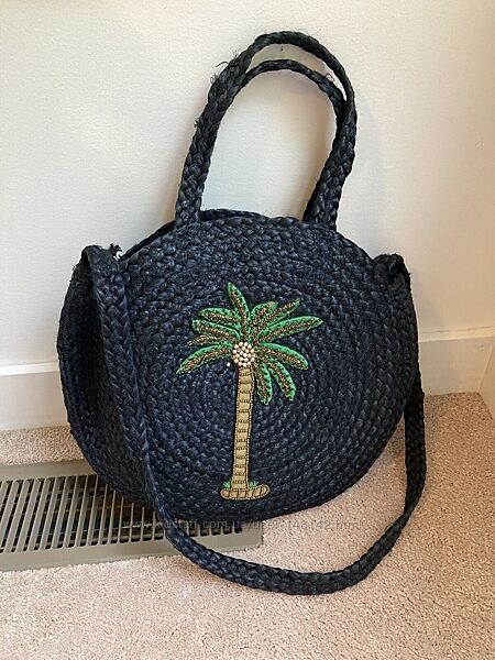 Круглая соломенная джутовая черная сумка-тоут пляжная с вышивкой сумка Forever 21Круглая соломенная черная сумка-тоут с вышитой нашивкой в виде пальмы с элементами из бисера, ручками сверху и плечевым ремнем. Диаметр 34 см ширина 9 см Длинная ручка 100 см