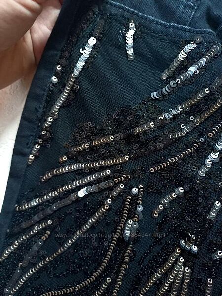Блестящие праздничные джинсы скинни с паетками и высокой талией Next, 10 pазмер. Не ношеные (сток). Красиво ложаться по фигуре. Cтрейчевые, отлично тянутся. Зауженные. Джинс отличного качества. Посадка высокая. В поясе - 38-41 cм. В бедрах - 46-50 см. Длина - 98 cм. Низ - 12 см. Посадка 25 и 37 см. Пересылаю.