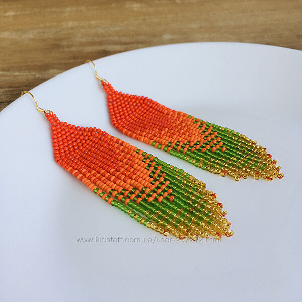Украсьте свой праздничный образ этими яркими бисерными сережками с бахромой. Серьги имеют градиентный узор из красного, оранжевого,зеленого и золотистого цветов.