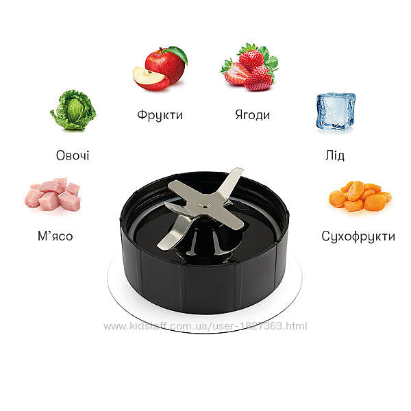Ножовий блок складається з 6 міцних лез із неіржавної сталі, що здатні подрібнювати тверді продукти. Призначений для приготування смузі, коктейлів, дитячого пюре, закусок, соусів — страв, які містять рідину або потребують додавання води.Не рекомендується мити у посудомийній машині.