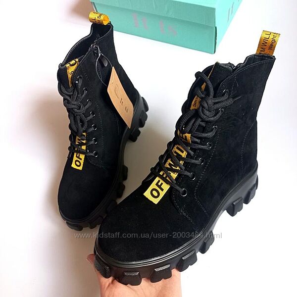 Стильні черевики з натуральної замші на тракторній підошві з жовтою стрічкою off white.