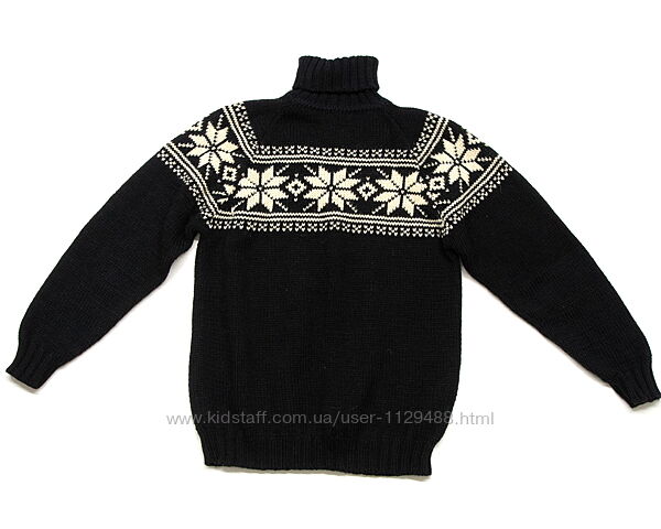 Толстый, мягкий, с высоким воротом, рукав реглан, совершенно не колючий, натуральный, крупной вязки с орнаментом в нордик стиле, цвет насыщенный черный с белым орнаментом.
